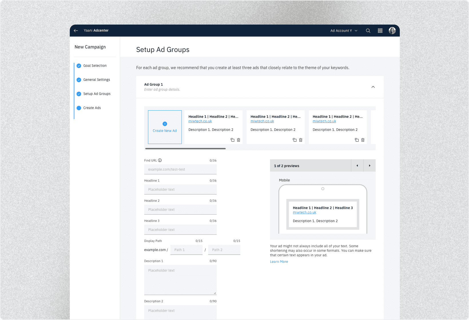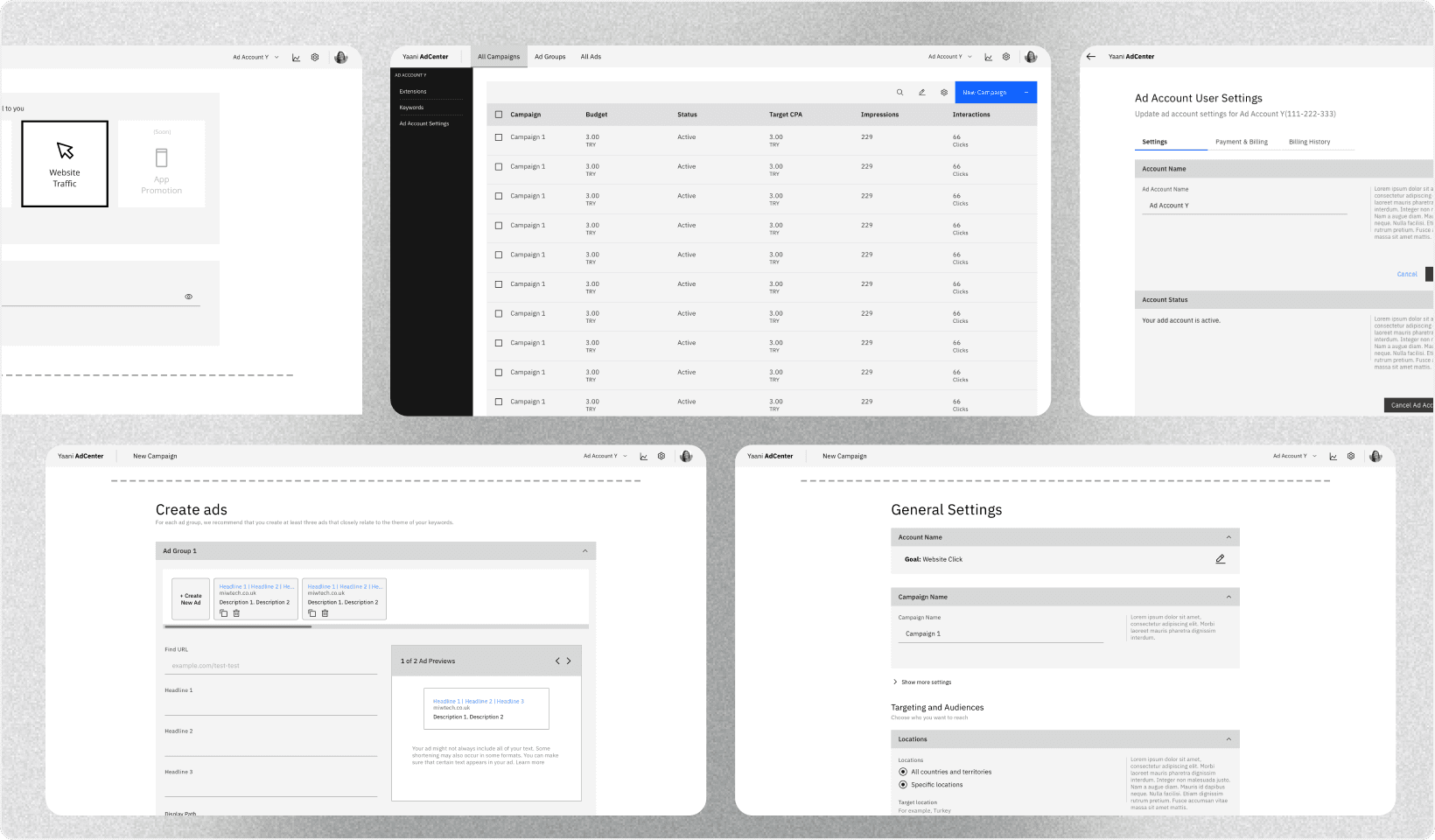 To quickly assess the functionality, we created high-fidelity wireframes using carbon components. This allowed us to produce screens efficiently and make adjustments to Adcenter's branding to achieve the final look and feel.